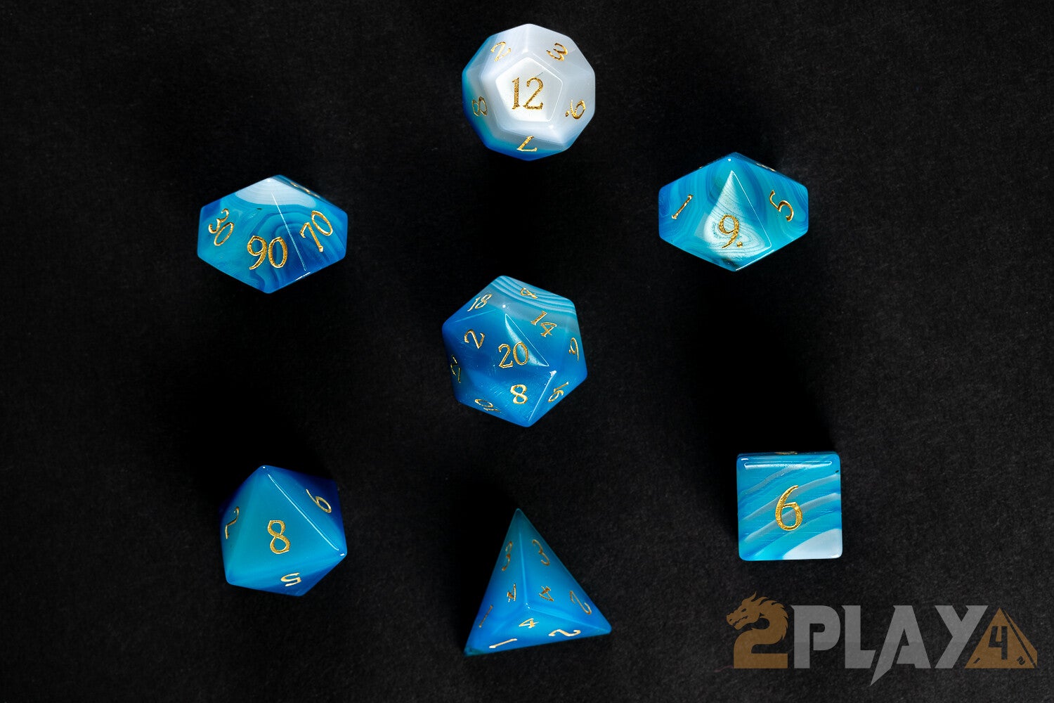 Shaped from luminous natural blue agate, these dice shimmer with an otherworldly charm, as though carved from the heart of an enchanted geode. Their swirling hues and steady weight evoke the power of hidden ley lines, turning every roll into a whisper of arcane destiny.