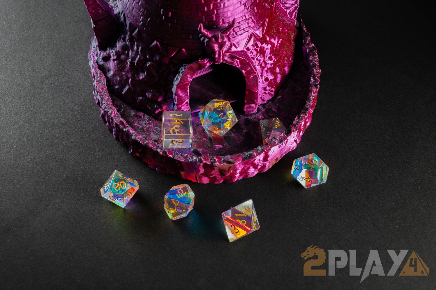 Forged from radiant prismatic glass, these dice gleam like shards of captured starlight. Their shifting colors dance with every movement, as though woven from the spectrum itself. Each roll feels like invoking a celestial spark, unpredictable, mesmerizing, and brimming with otherworldly wonder.