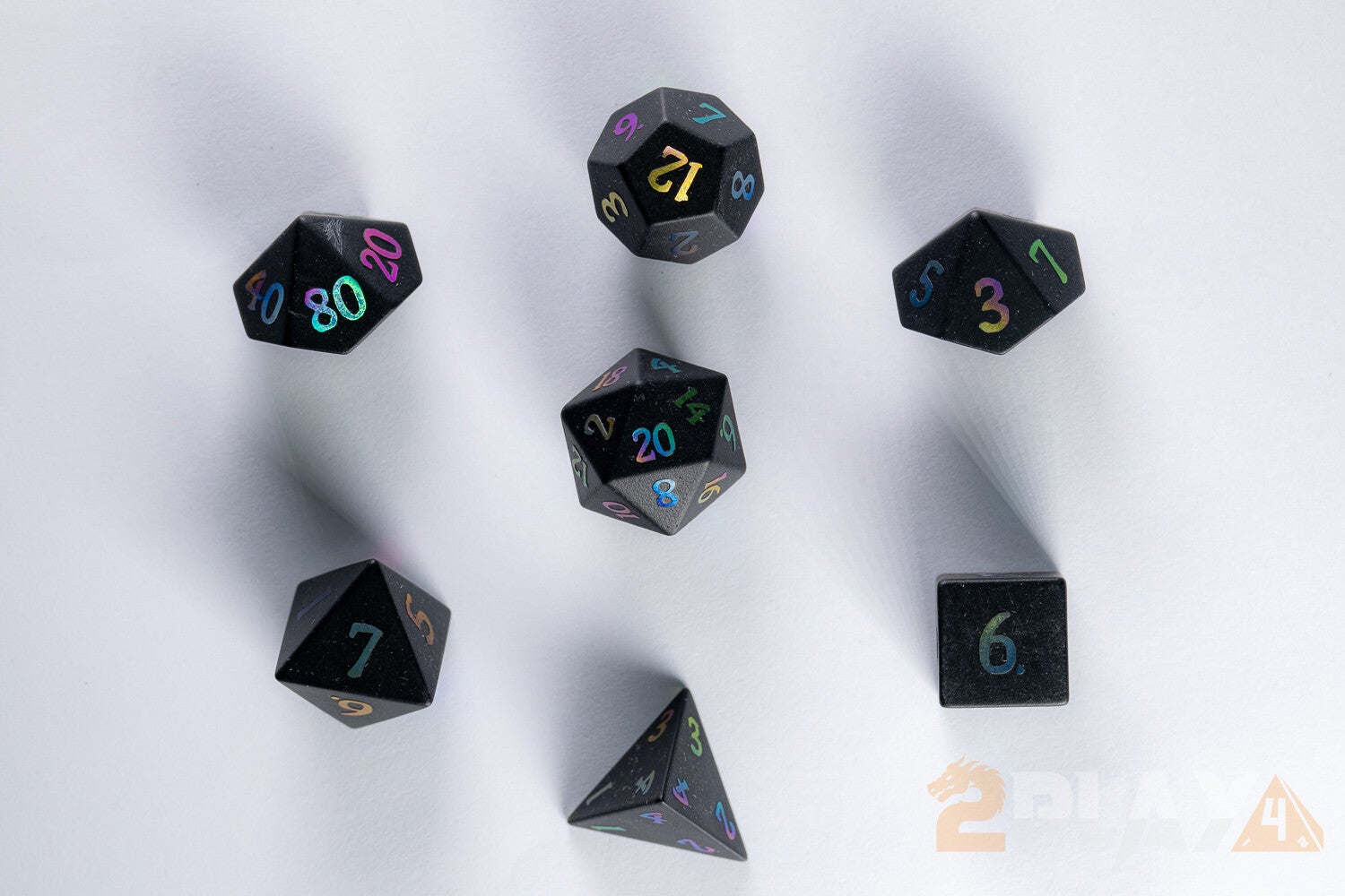 Forged from natural obsidian stone and finished with a smooth frosted sheen, this striking dice set brings an air of mystery to every roll. Each face is adorned with shimmering holographic numbers that catch the light, creating a stunning contrast against the dark, volcanic stone.