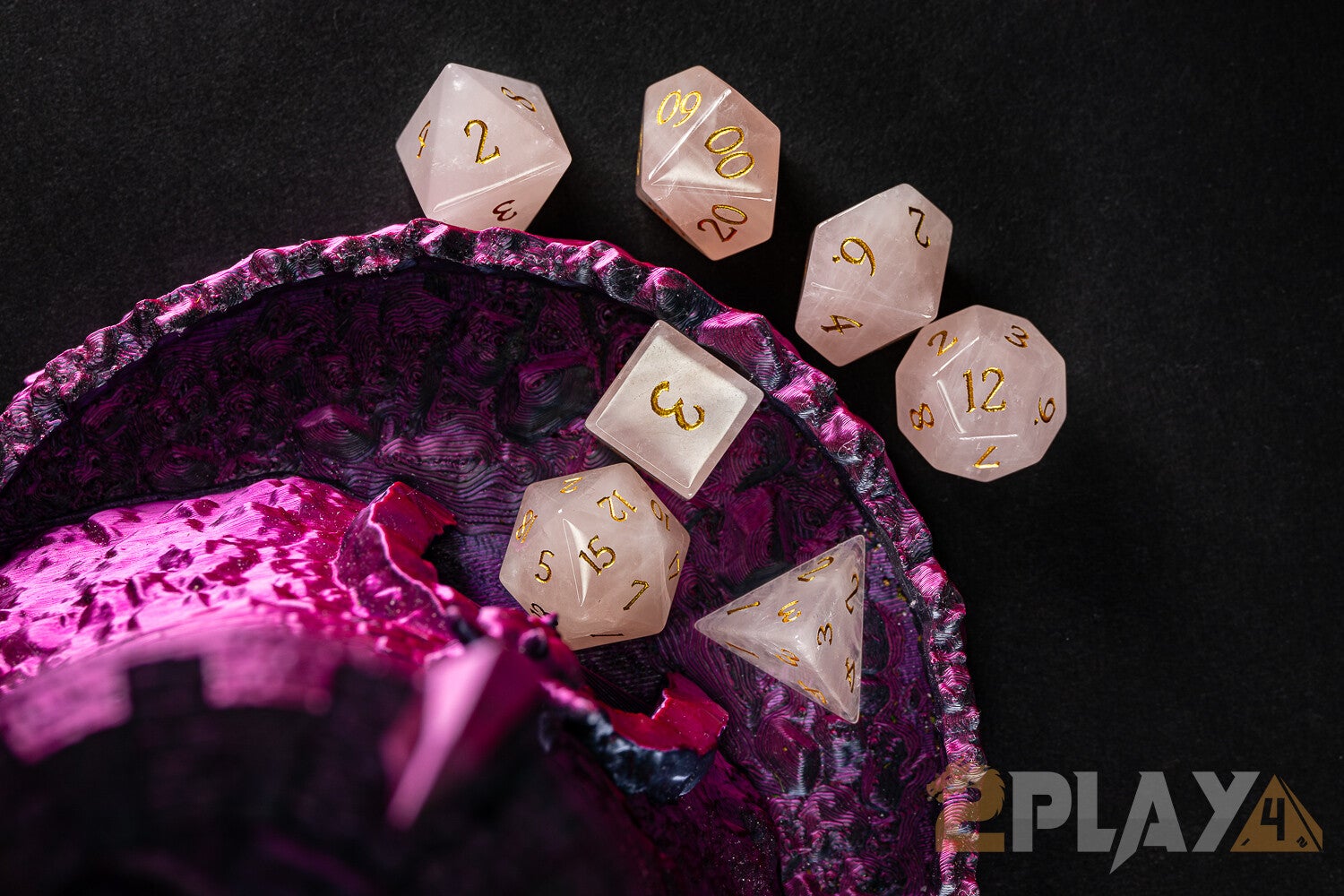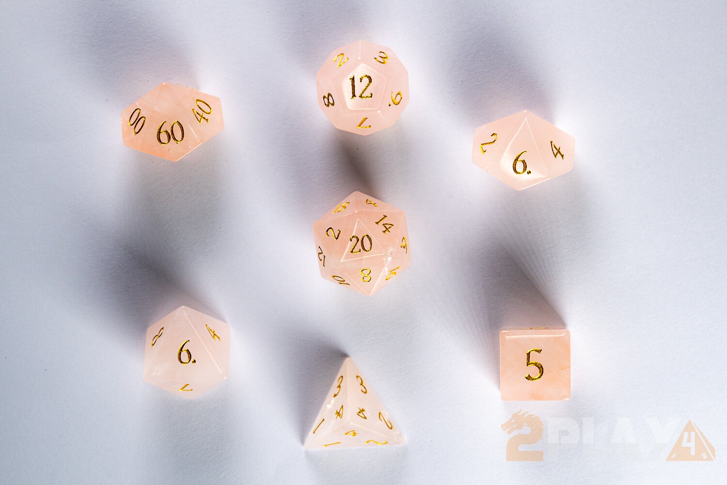 Shaped from genuine rose quartz, this enchanting dice set glows with soft pink hues and a gentle, natural translucence. Each die carries the stone’s signature warmth and calming presence, giving your rolls both elegance and intention. Smooth, weighty, and beautifully unique.