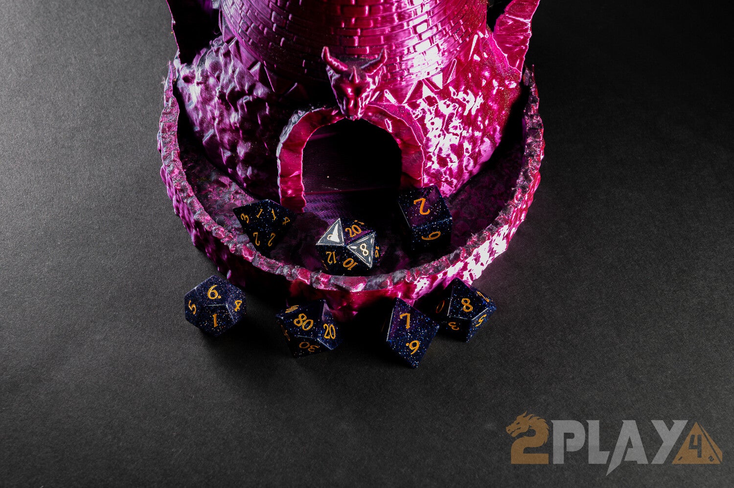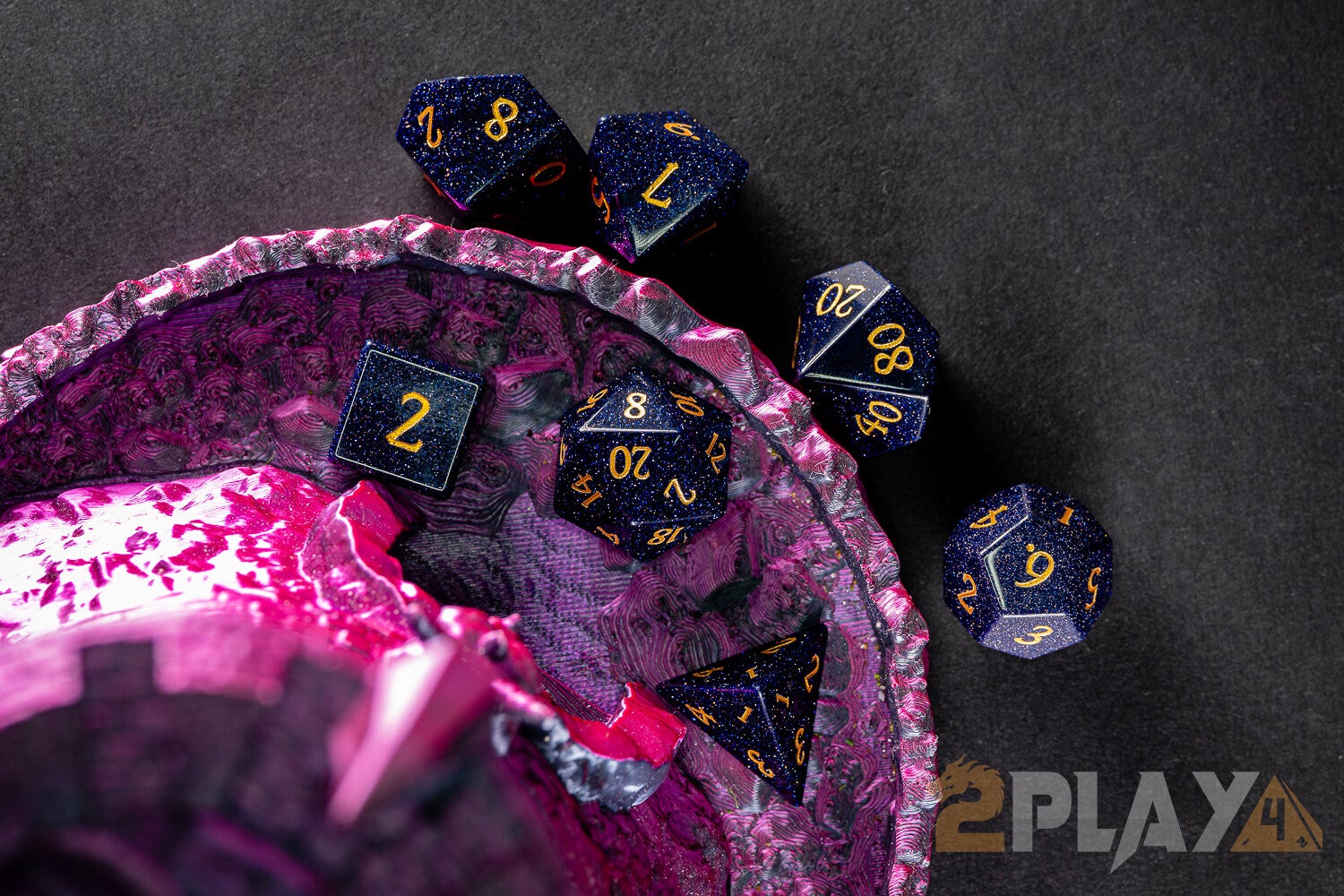Born from deep-earth stone infused with shifting hues of violet and midnight blue, this dice set carries the essence of starlit realms and hidden arcane wells. Each die shimmers with natural veining that looks like cosmic currents trapped in crystal, mystic pathways that whisper of forgotten spells and distant skies. Solid, radiant, and enchantingly otherworldly, these dice are perfect for adventurers who draw their power from the twilight between magic and night.
